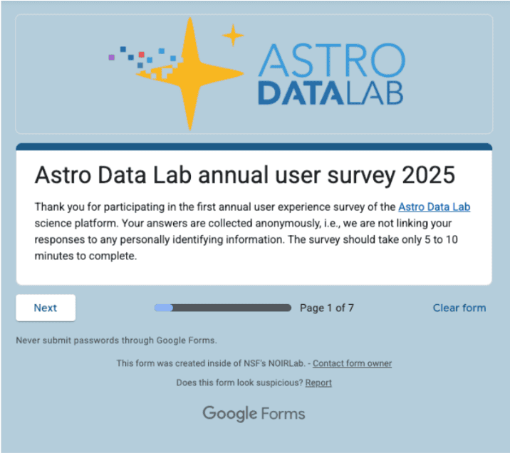 The first annual user survey for Astro Data Lab has been successfully completed, gathering insights from 71 participants between August 22 and September 30, 2025. This comprehensive survey, which included 17 varied questions ranging from open response to multiple-choice options, aimed to understand how users leverage the platform for their research, the challenges they face, and their suggestions for future enhancements. Overall, users rated their satisfaction with Data Lab at 4.33 out of 5 stars.