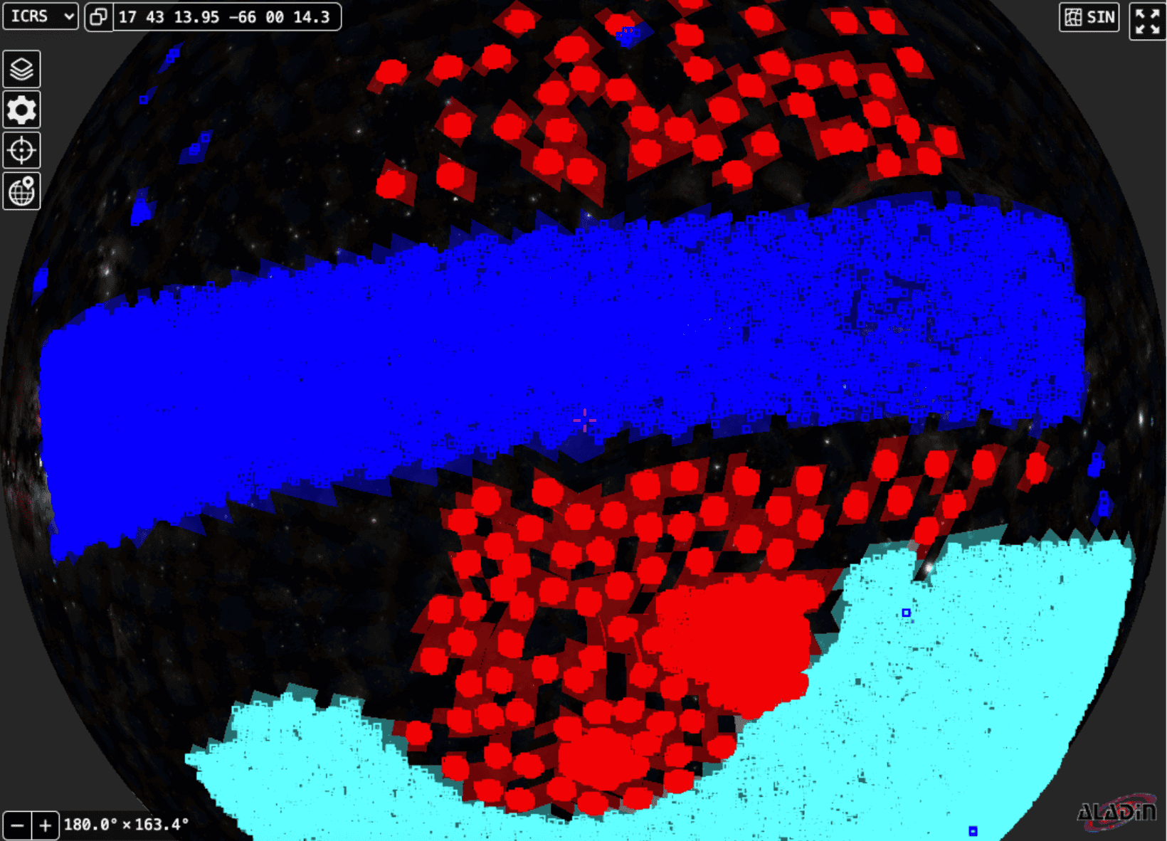 Figure: Multi-Order Coverage (MOCs) maps created for des_dr2.main (cyan), smash_dr2.object (red), and decaps_dr2.object (dark blue) tables displayed with the Aladin Lite viewer. Displaying MOCs like this helps visualize which parts of the sky each survey hosted by the Data Lab covers.