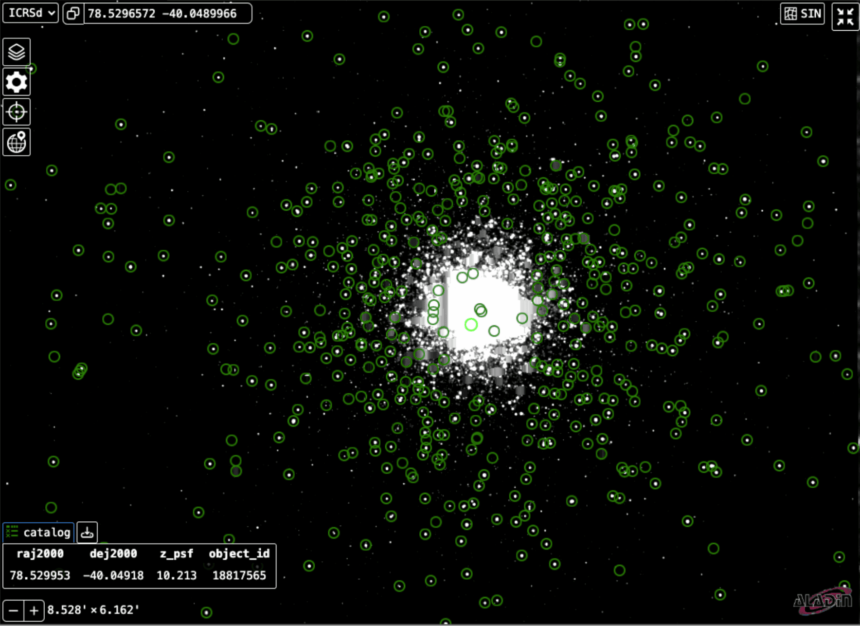 Figure: Data from skymapper_dr4.master overplotted on the globular cluster NGC 1851 with Aladin Lite. The interactive viewer lets you pan across the sky and interact with each data point.