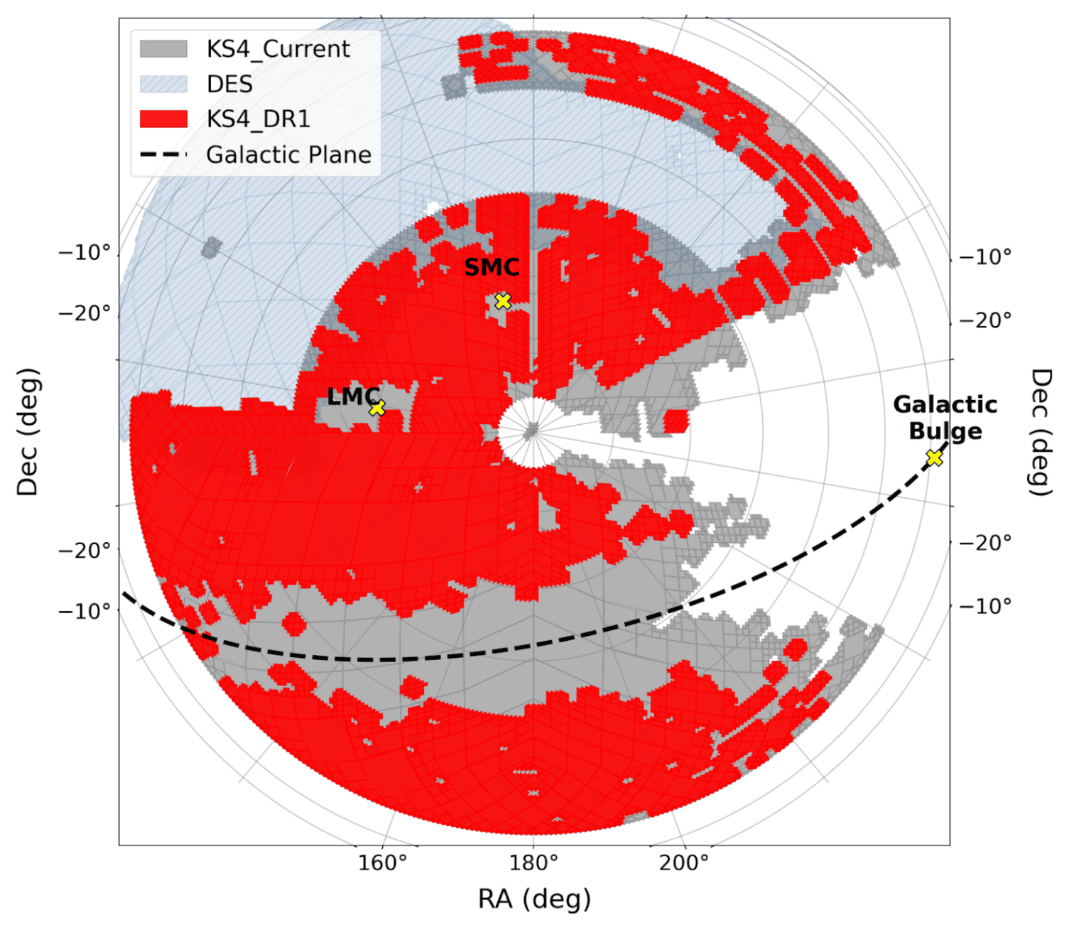 Figure: Multi-Order Coverage map of the KS4 DR1 sky coverage, presented in a polar projection centered on the South Celestial Pole (Dec = -90°).