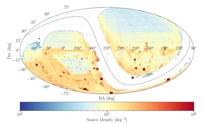 Figure: The source density map of LS-PSC from Liu et al. 2025. The red boxes indicate the bricks containing sources labeled as bailout. The actual size of the bricks (~0.25 deg x 0.25 deg) is much smaller than the box size. The dash line marks the Galactic plane. The source density in the northern footprint (covered by BASS and MzLS) is significantly lower than that in the south (covered by DECam-based programs such as DECaLS and DES).